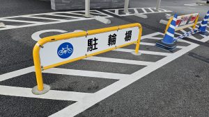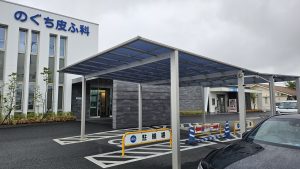 「障害者等用駐車場」横に屋根付き駐輪場を設けております。自転車・バイクでご来院の方はこちらをご利用下さい。